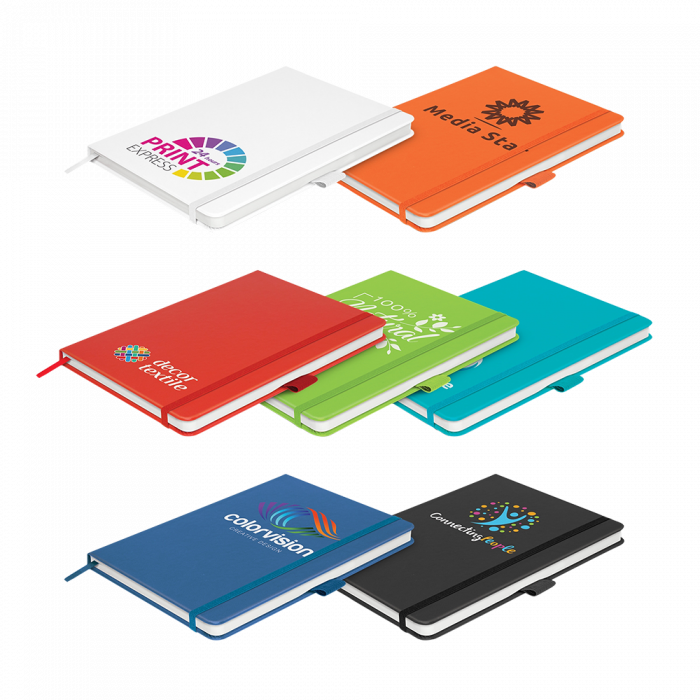 Medium-size notebook which has a hard cover with a smart PU finish. It has 80 leaves (160 pages) of 70gsm lined paper, a bookmark ribbon, an elastic closure band and an elastic pen loop.